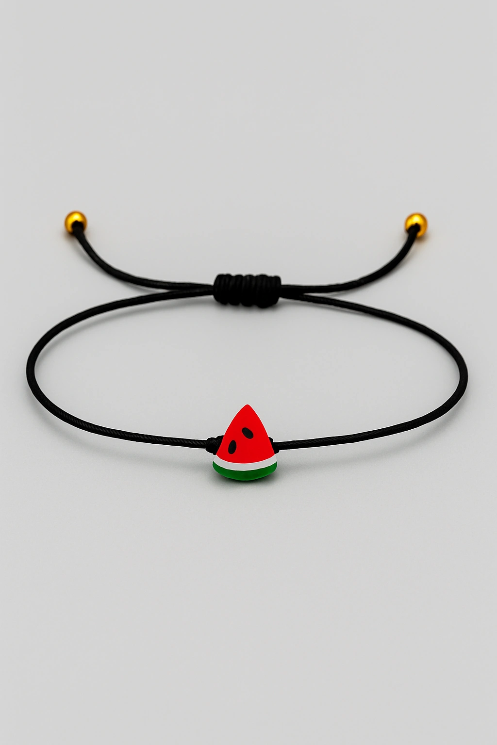 Playful watermelon charm on a slim black cord Free Palestine bracelet. A small, colourful way to show your support for Palestine while keeping your summer jewelry fun and light.